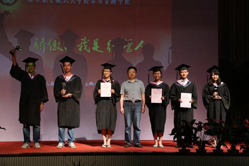 在一段震撼的开场视频后,毕业典礼拉开帷幕。视频《我眼中的班主任》以及《班主任毕业寄语》让同学们感受到了班级凝聚的力量。随后毕业生代表向班主任老师代表鲜花表达四年的培养之情。党委书记李遥老师为夏前广等六位获得大学成就奖、优秀毕业生、十佳就业之星的同学颁奖。优秀毕业生代表夏前广同学发言,表达了对母校和学院四年培育的真诚谢意,表示将铭记“尚德励学 筹策济世”的院训,立志成为拥有智慧并富有激情、胸怀大志并脚踏实地、富有责任感并敢于挑重担的经管人。