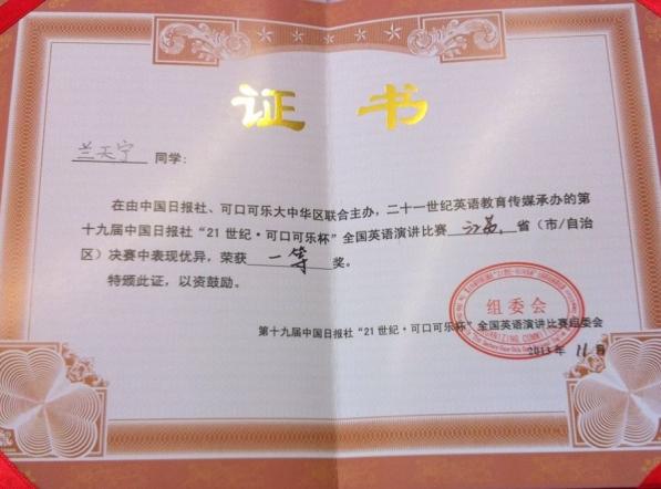 11月9日,第十九届中国日报社“21世纪•可口可乐杯”全国英语演讲比赛江苏赛区决赛在南京师范大学仙林校区举办,贝博官网2012级本科生兰天宁获得一等奖,这是近年来我校非英语专业学生在同类赛事中获得的最佳成绩!