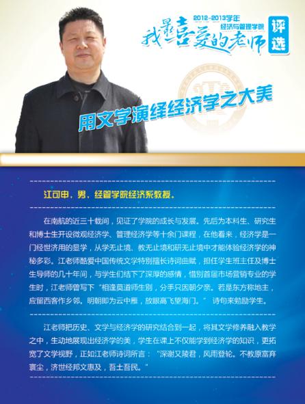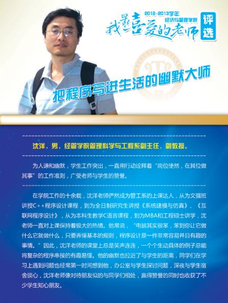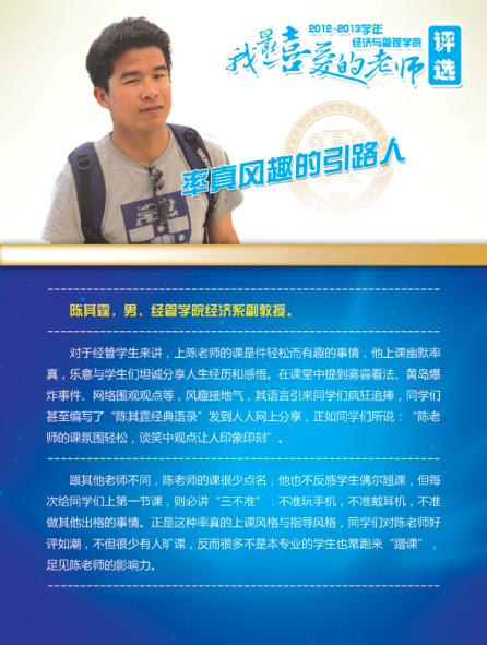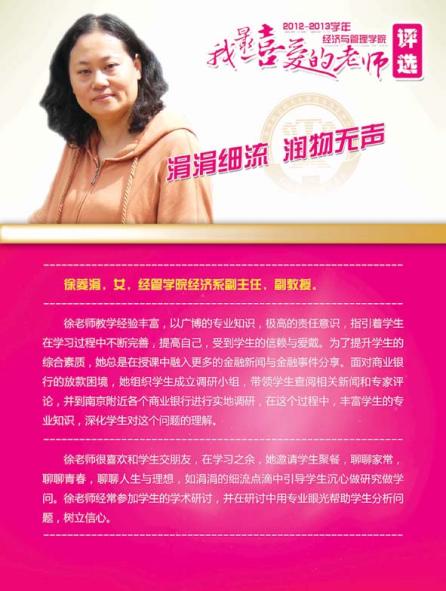 通过学院各系部及学生推荐评选,学院涌现出了一批深受学生喜爱的优秀教师,这些老师当中有认真做学问踏实上讲台的青年骨干,有实践式教学案例式授课的专业学者,有把程序写进生活的幽默大师,有竞赛场上意气风发的指导名师,有默默无言资助无数学生的“摇钱树”,有用文学演绎经济学之大美的系部中流砥柱,有指导学生自主式成功创业的帮帮老师,让我们走进这些老师,品读他们的感人事迹!