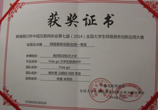 2014年12月1日,邮储银行杯第七届全国大学生网络商务创新应用大赛总决赛在北京邮电大学隆重举行。我校BB贝博艾弗森官方网站信息管理与信息系统专业学生姚叶慧、王颖钏、闫帅和电子商务专业学生李坚同学组成的“Free Go”团队获得总决赛一等奖。