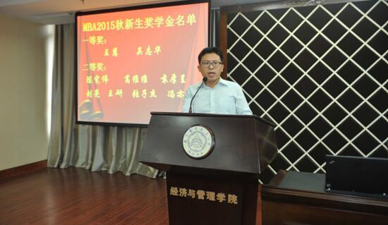 接着,院长助理周鹏教授作为教师代表发言,他首先对获奖新生表示了祝贺,同时站在一名MBA任课教师的角度,和大家一起分享了MBA课堂教学的切身感受,对新生们研究生阶段的学习提出了积极诚恳的建议。