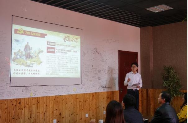 本次活动由2013级本科生党员俞佳炜主持,他风趣生动地介绍了红军长征的历史背景,带领大家一同回顾了习近平总书记在纪念红军长征胜利80周年会议上的讲话,并结合自己在大学生活中的体会分享了他眼中的长征精神:“长征精神应当是学会总结经验,并勇于改正错误……还应当有坚定的理想信念,才能带领我们不断前行。”