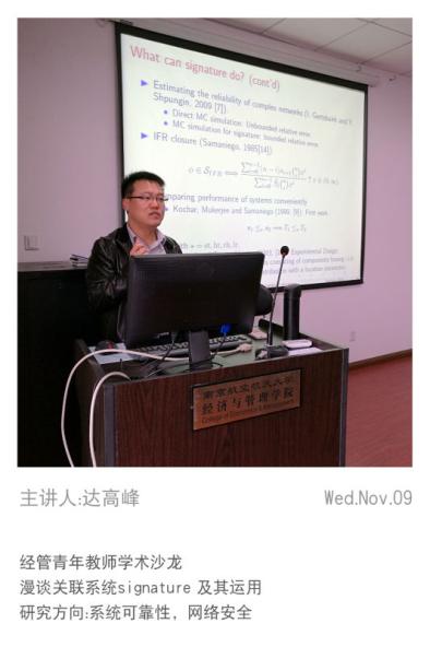 达高峰报告主题为“漫谈系统Signature及其应用”。报告中,达高峰博士简要介绍了Signature理论的发展历程,回顾了近些年有关Signature的计算以及Signature在系统可靠性优化、复杂网络可靠性估计、元件寿命统计推断等方面的应用,并介绍了自己在Signature计算和随机性质等方面的最新研究成果及其相关应用。