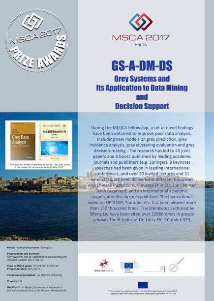 刘思峰教授于2013年荣获欧盟第七研究框架居里夫人国际人才引进计划Fellow(Senior)项目资助,经批准于2014-2016年赴英国De Montfort大学执行研究计划。期间,项目团队在贫信息分析方法与模型技术研究方面取得多项重要突破,提出了原始差分GM(1,1)模型、均值差分GM(1,1)模型、分数阶灰色预测模型、基于混合可能度函数的灰色聚类评估模型、聚核权向量组和两阶段灰色决策模型等一系列新模型、新方法;解决了中国商飞公司、中国航天科技集团公司、中国航空工业集团公司、华润电力集团公司和德国沃克微波公司等企业技术、管理难题,取得显著社会、经济效益;获国防科学技术奖一等奖、江苏省科学技术奖(自然科学)一等奖等省部级一等奖4项;发表学术论文40多篇(含JCR一区论文15篇),由Springer和科学出版社等出版学术著作4种;中、英两国学者在国际会议作大会报告8次,应邀在欧洲和中国学术机构讲学20多次,组织国际学术会议6次,并于2015年发起成立了国际灰色系统与不确定性分析学会。