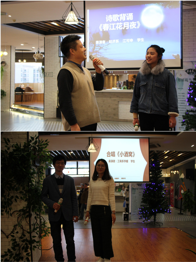 联欢晚会的节目更是异彩纷呈,各具特色。“有缘千里来相会”2017年新入职教师一曲合唱《渡情》,并分别表达加入经管大家庭的欣喜和对未来发展的期待,为晚会拉开帷幕;“亲爱的朋友们,让我们自豪的举起杯,挺胸堂,笑扬眉,光荣属于经管奋斗的每一辈!”由院领导改编的《经管的朋友们今天来相会》,倾情的演唱赢得了全场热烈的掌声;由经济系江可申老师带来的师生配乐诗朗诵《春江花月夜》,极富哲理意味,充满人生的感慨;“如果还有梦就追,至少不会遗憾后悔”教育培训中心的一曲《远走高飞》激励着老师们在新年迎着光勇敢追求梦想;管工系马静老师的一曲《卓玛》,浑厚高亢的嗓音展现了浓烈的高原风情;经管女教工舞蹈天团的古典团扇舞《太湖美》,极富江南韵味,婀娜多姿,温婉优雅,将晚会推向高潮;工商系李媛老师及学生甜美的师生对唱《小酒窝》,给晚会带来一抹清新的靓丽。联欢会上,大家共同为一年来“家有喜事”的老师们送上温馨的祝福,其乐融融。首届扑克大赛,采用团队合作的方式抽签对战,在欢声笑语中比拼智力及应变能力,最终12名教工获得扑克比赛优胜奖。