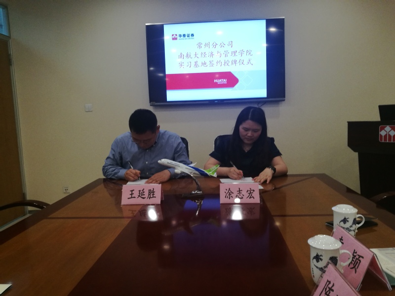 本着资源共享、发展共赢、协同育人的宗旨,进一步加强校企双方的交流与合作,5月24日,经管学院与华泰证券常州分公司在常州举行了大学生实习实践基地签约揭牌仪式。学院副书记涂志宏、金融专业学科负责人段进东教授、工商管理学科负责人陈万明教授、学生辅导员代表以及华泰证券常州分公司总经理王延胜、溧阳营业部经理施岳锋、分公司运营部经理崔磊等共同参加了本次活动,并就大学生的就业创业、实习实践和人才培养等方面开展了深入座谈,积极探索建设校企协同育人新模式。