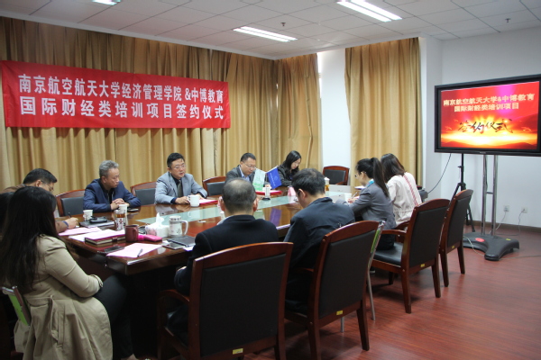 10月29日上午,BB贝博艾弗森官方网站与广州中博教育股份有限公司项目培训合作签约仪式在经管楼602室举行。中博教育董事长毛金明、南京分公司总经理卢江、江苏校区合作部经理冀玉、江宁区域经理陈晓凯,以及经管学院领导班子成员参加了本次签约仪式,仪式由学院办公室主任任慈主持。