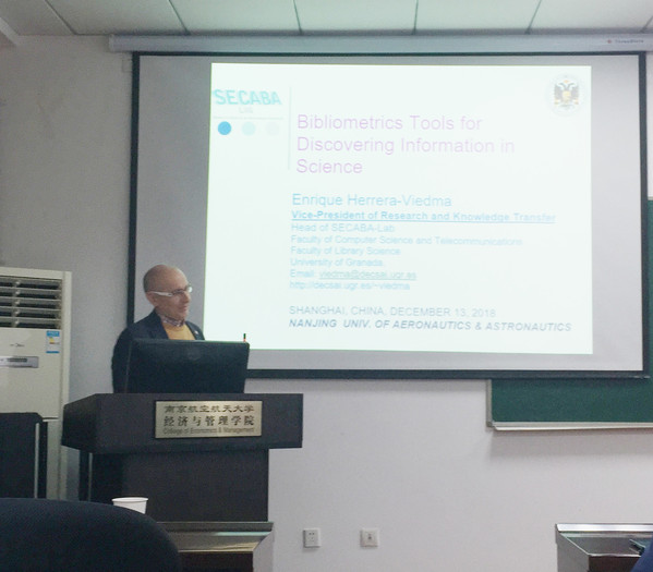 2018年11月13日上午,格拉纳达大学计算机科学和人工智能专业的教授Enrique Herrera-Viedma受贝博官网智能决策与风险分析研究所邀请,经管学院做了题为Bibliometric Tools for Discovering Information in Science的讲座。经管学院朱建军教授、章玲教授、关叶青副教授、河沙玮讲师等老师以及部分硕博研究生参与了活动。