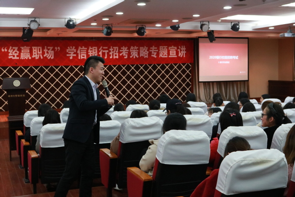 银行是经管学生毕业后的主要就业方向,为了提高学生的行业认知,提升就业竞争力,3月12日晚上,学院邀请江苏省高校招生就业指导服务中心下属的学信学院教学研究院副院长梅高翔来贝博官网开展了主题为“2020届毕业生银行招考策略”的宣讲会。