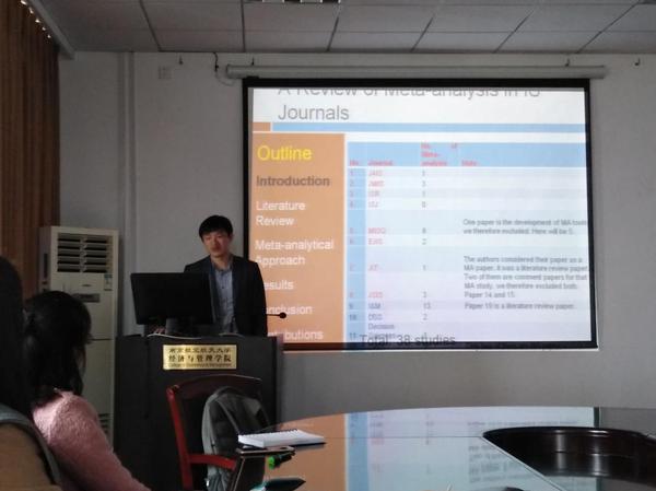 2019年3月29日下午,西安电子科技大学牟健老师受贝博官网信息管理与电子商务研究所邀请,在BB贝博艾弗森官方网站706室做了题为“How to integrate meta-analysis and SEM to do IS research”的讲座。贝博官网肖琳、刘丽丽、刘文龙、何昌清、宋连莲等教师及部分硕、博研究生现场聆听了牟老师的报告,本次学术讲座由肖琳老师主持。