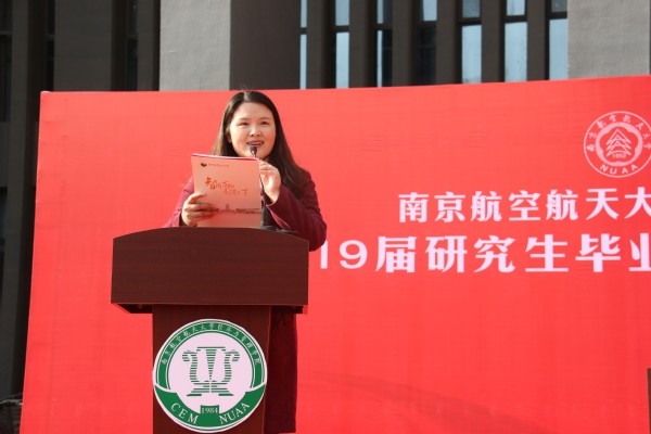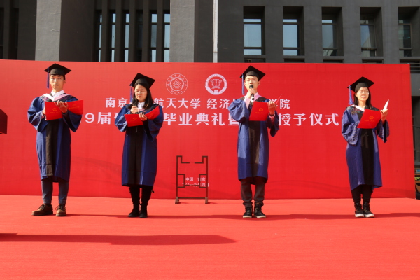接下来,由王海谊等四名毕业生朗诵了一首由周德群等老师创作的《经管梦》。“强特色,争一流,经管梦,代相传”,在四位同学的朗诵声中,回顾了BB贝博艾弗森官方网站建院35年来从无到有、由弱变强的发展历程,激发了同学们爱校荣院的感情,最后全体毕业生齐声喊出“我骄傲,我是南航经管人”,将毕业典礼推向了高潮。