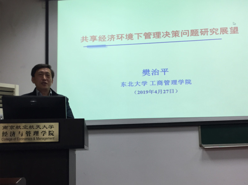 2019年4月29日上午,东北大学教授、教育部长江学者特聘教授、国家杰出青年科学基金获得者樊治平教授受贝博官网智能决策与风险分析研究所邀请,在南航将军路校区BB贝博艾弗森官方网站704作了题为“共享经济环境下管理决策问题研究展望”的讲座。在讲座中与到场同学以及老师进行了深度交流。BB贝博艾弗森官方网站众多老师以及硕博研究生参与活动。