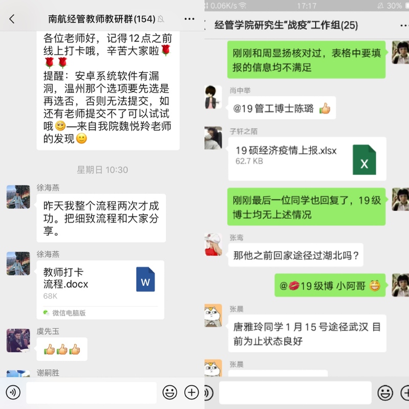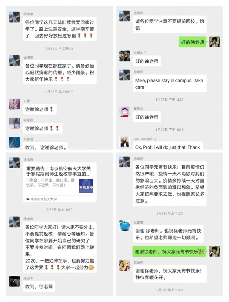 面对这个特殊的寒假,在不能外出和返校的情况下,线上课题组群成为了团队成员交流学习的精神家园。导师徐海燕教授时刻关注、关心着学生们的身体状况和学习情况。在课题组群中,大家会第一时间收到徐海燕老师分享的最新疫情资讯、学校和学院的重要通知、科学防护指南。此外,他们还相互送去节日祝福和暖心问候。“隔离病毒,但不隔离爱”,家住湖北的邓潇同学是团队成员最为关心的对象。疫情爆发后,大家第一时间就与邓潇同学取得联系,表示关心与慰问。此后团队成员一直密切关注她的身体健康情况,了解其生活所需并及时给与帮助。