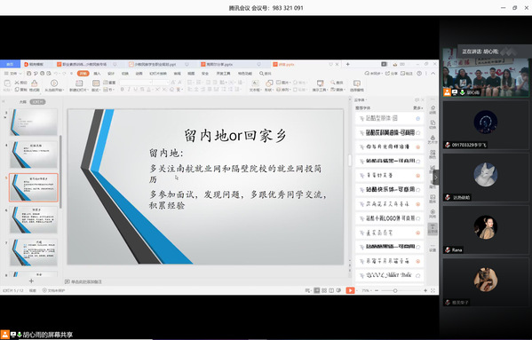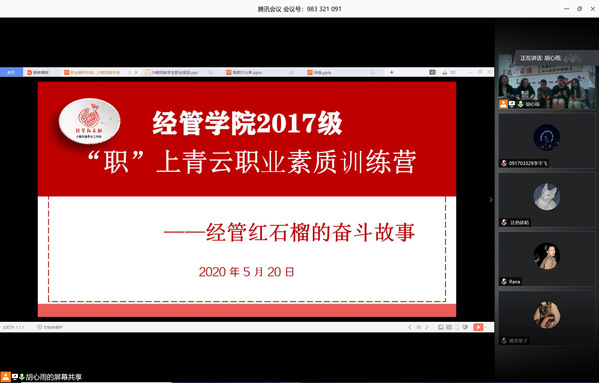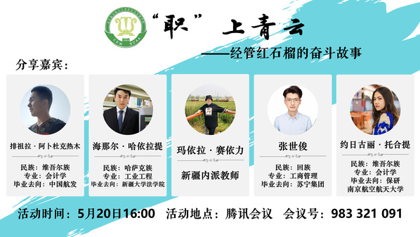 5月20日,BB贝博艾弗森官方网站举办“‘职’上青云职业素质训练营——经管红石榴的奋斗故事”交流分享会,活动采取线上线下相结合的形式,邀请新疆内派教师玛依拉•赛依力以及16级优秀毕业生针对新疆籍少数民族学生的职业生涯规划进行专题分享, 40余名学生参与本次交流会。
