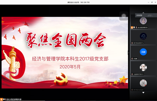 5月28日,十三届全国人大三次会议胜利闭幕,本次两会是党的十九届四中全会后首次召开的两会,中国在此次疫情大考中交出一份赢得世界赞誉的“中国答卷”,使得本次全国两会备受世界关注。为增强学生党员对国政时事的关注度,提高学生党员的思想政治觉悟,经管学院17级党支部在“两会”召开之际,组织全体学生党员开展了“看两会、悟精神、议观点”宣贯活动。