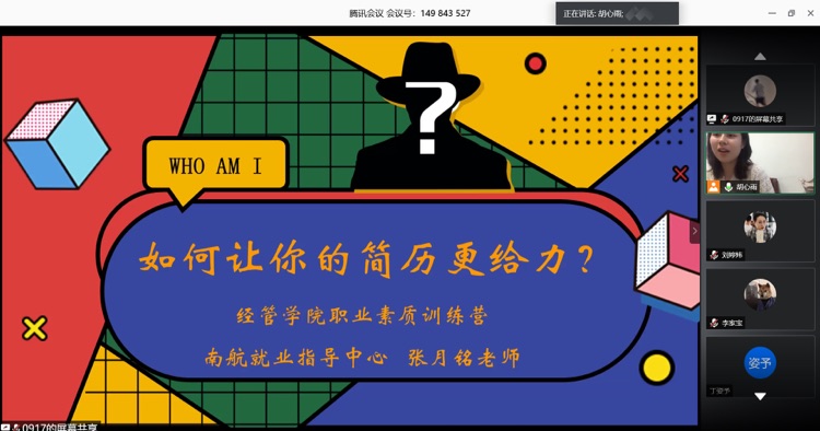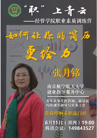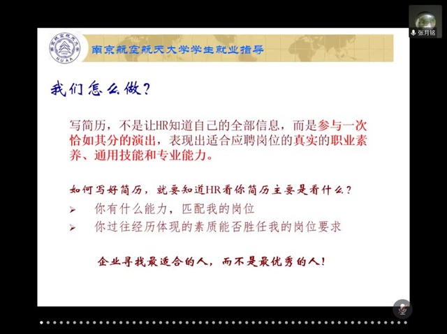 为落实学校党委关于“稳就业”的相关决策部署,切实提升学生就业竞争力,6月11日晚,BB贝博艾弗森官方网站邀请南航就业创业指导服务中心张月铭老师开展“‘职’上青云:如何让你的简历更给力”线上专题讲座,辅导员胡心雨、刘婷炜以及200余名学生参加了本次活动。