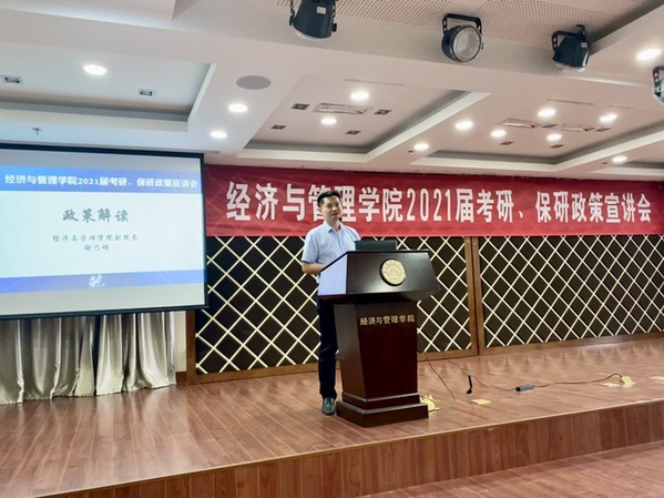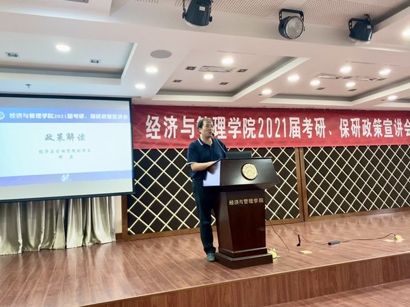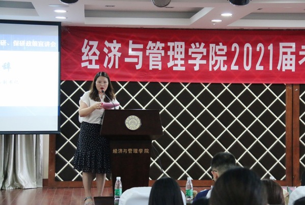 为了帮助2021届毕业生了解贝博官网研究生招生政策,合理规划考研、保研目标,提升学院生源质量,8月27日,BB贝博艾弗森官方网站在A0305报告厅开展2021届考研、保研政策宣讲会。经管学院副院长邓晶、谢乃明,党委副书记涂志宏,管工系系主任马静、副主任虞先玉,工商系副主任刘文龙,经济系副主任查冬兰,辅导员及百余名2017级学生参加了本次活动。