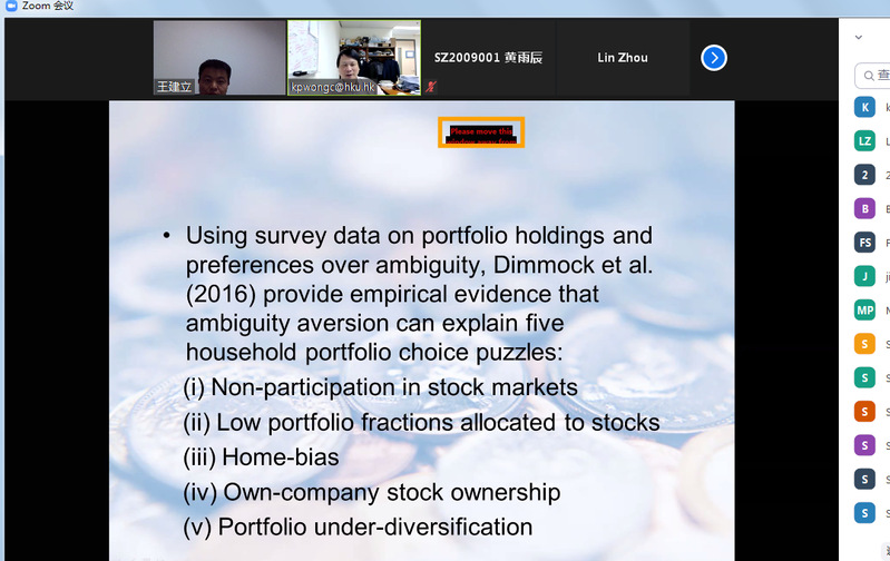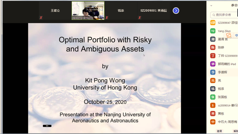 10月25日,香港大学教授Kit Pong Wong应BB贝博艾弗森官方网站金融研究所邀请,在线上为我校师生作了一场题为“Optimal Portfolios with Risky and Ambiguous Assets”的精彩学术讲座。讲座由金融研究所所长王建立主持。教授袁潮清、副教授桑秀芝、陆珩瑱、苏飞等教师及部分硕、博研究生参加了本次学术交流。