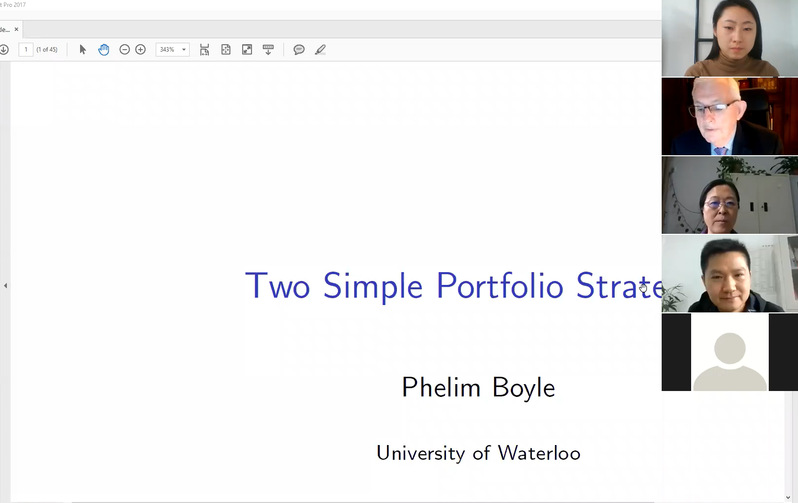 10月26日上午,加拿大威尔弗里德·劳里尔大学教授Phelim Boyle受学院智能决策与风险分析研究所邀请,在ZOOM会议做了题为“Two Simple Portfolio Strategies”的讲座。贝博官网教授徐海燕等教师及部分硕、博研究生线上参加了Phelim Boyle的报告分享,本次学术报告由徐海燕主持。