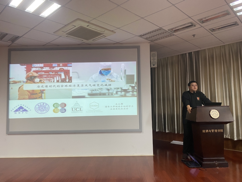 清华大学特聘教授关大博接着为大家作了题为《后疫情时代的全球经济复苏及气候变化减排》的报告。关大博展示了其团队领衔开发的中国碳排放数据库(CEADs),介绍了其团队近期完成的两项研究工作,主要分析了在不同的情境设定下后疫情时代全球碳排放强度的变化情况,并在此基础上详细论证了中国疫情控制手段对缓和全球经济下行的重要作用,以及全球合作抗疫的必要性。关大博建议各国政府应抓住疫情窗口期,通过数据共享,节约消费和公众沟通等抓手实现碳中和的远期目标。