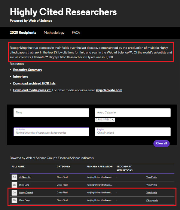 (网页链接:https://recognition.webofscience.com/awards/highly-cited/2020/)