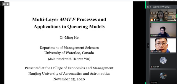 11月25日上午,加拿大滑铁卢大学教授Qi-Ming He受学院智能决策与风险分析研究所邀请,在腾讯会议作了题为“Multi-layer MMFF processes and Applications to Queues with Customer Abandonment”的讲座。贝博官网教授徐海燕等教师及部分硕、博研究生线上参加了Qi-Ming He的报告分享,本次学术报告由徐海燕主持。