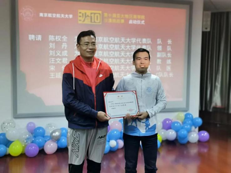 当天,南航沙9队长陆杨也来到了现场。在今年8月沙九赛场上,南航代表队获得了12名的好成绩,并捧回亚沙赛团体最高奖项“沙鸥奖”奖杯。在启动会现场,陆杨也分享了自己从“跑步小白”蜕变成“百公里神兽”的心路历程。