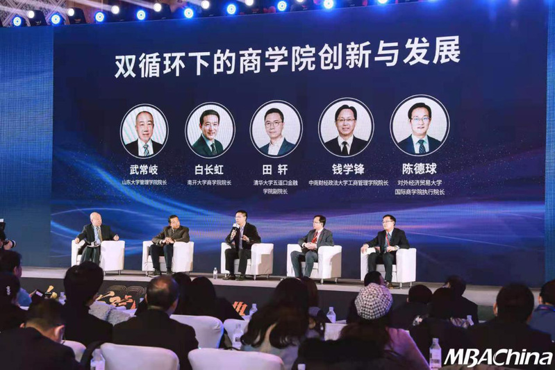 圆桌对话环节,山东大学管理学院院长武常岐担任主持人,南开大学商学院院长白长虹、清华大学五道口金融学院副院长田轩、中南财经政法大学工商管理学院院长钱学峰、对外经济贸易大学国际商学院执行院长陈德球针对“双循环下的商学院创新与发展”进行了深入的交流。