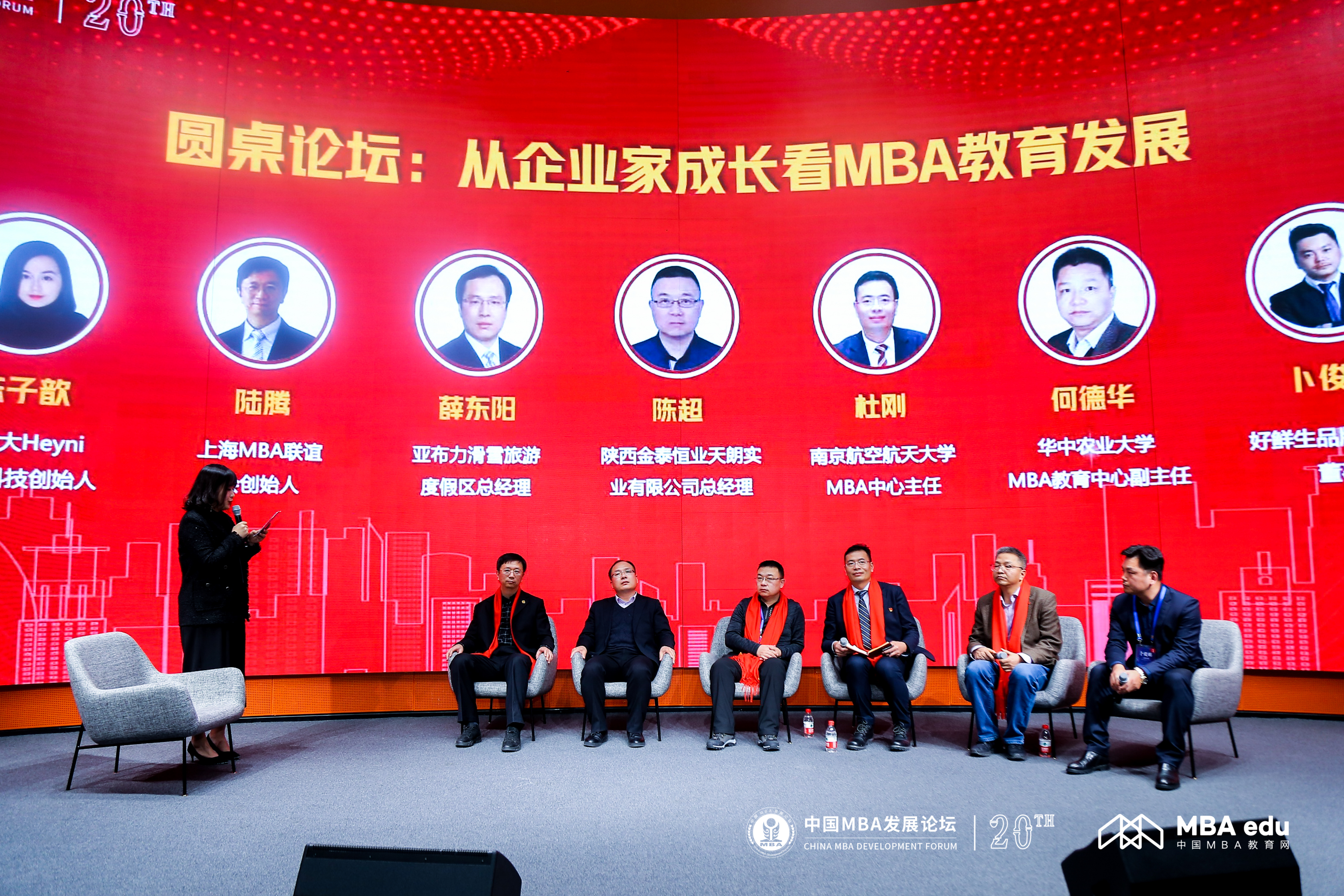BB贝博艾弗森官方网站MBA中心执行主任杜刚,上海MBA联谊会创始人陆腾,亚布力阳光度假村总经理薛东阳,陕西金泰恒业天朗实业有限公司总经理陈超,华中农业大学MBA教育中心副主任何德华,好鲜生品牌创始人、董事长卜俊鹏围绕“从企业家成长看MBA教育发展”主题进行圆桌分享。MBA共享部落温哥华分站站长、加拿大Heyni中文科技创始人陈子歆主持论坛。