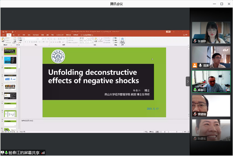 5月17日,燕山大学经济管理学院教授杨春江应BB贝博艾弗森官方网站人力资源管理研究所和江苏省人力资源发展研究基地的邀请,在线上作了题为“消极震撼事件的影响及机理研究——基于服务业一线员工的调查”的精彩学术报告。本次报告由教授胡恩华主持,年轻教师、博士生和硕士生参加了此次学术报告活动。