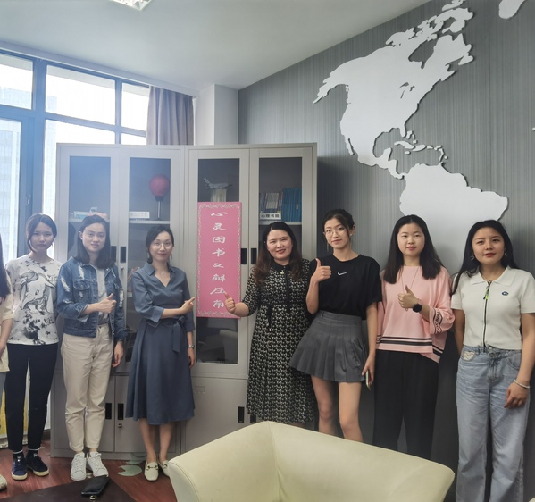最后,胡心雨带领大家参观了“心苑时光社”心理工作站,经管学院划拨506办公室作为心理健康室,为心理健康教育提供场地支持,开设“心灵图书&解压角”,摆放有关心理减压、人际交往、导学关系等方面的心理书籍和减压工具,旨在为学生创造一个舒缓心情的绝佳场所。涂志宏、陈瑜共同为心理工作站以及心灵解压角挂牌。