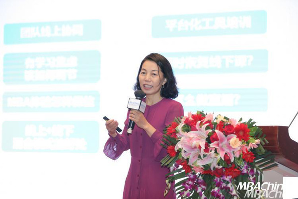 长江商学院助理院长杨晓燕在会上进行了精彩分享。她指出,在疫情冲击下的商科教育,需要适应新模式,并详细解答了如何保持MBA体验、线上+线下混合模式的优势以及如何推广活动数字化等问题。