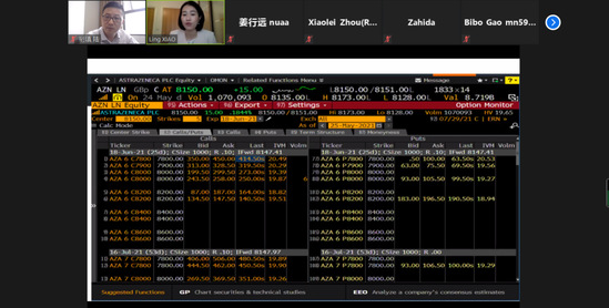 南航经济管理学院8位硕士研究生与伦敦大学皇家霍洛威学院10位硕士研究一起进入线上课堂。教学活动按照中英两个小组,使用Bloomberg实时股票价格数据和期权数据验证B-S模型,通过实时计算的期权价值与实际交易的期权价格进行比较,深入讨论二者的差异原因。