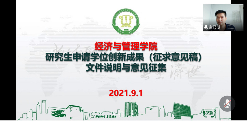 为广泛征集师生意见,进一步推动高质量研究生教育教学工作,9月1日,学院分管研究生教育教学副院长谢乃明通过腾讯会议平台,分别面向博导、研究生群体开展了关于学院研究生申请学位创新成果(征求意见稿)的文件说明及意见征集。