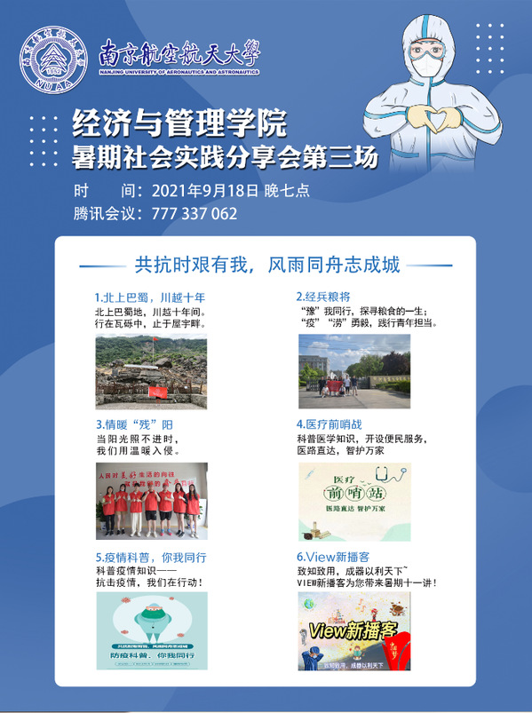 9月18日晚,BB贝博艾弗森官方网站“共克时艰有我,风雨同舟志成城”暑期社会实践交流会第三场于线上腾讯会议顺利开展。来自经管学院的6支实践团队分享了他们的实践活动,讲述他们不同形式抗击疫情灾情的经历,他们将“共克时艰”放在心中,“众志成城”付诸行动,呈现出危难时刻、挺身而出的青年形象。BB贝博艾弗森官方网站团委书记刘小杨及实践团队成员参加此次交流会。
