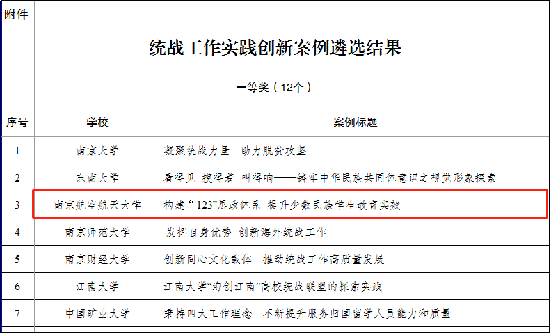 近期,江苏省委教育工委公布了“同心向党•教育有我”统战工作实践创新案例遴选结果,贝博官网党委报送的创新案例“构建123思政体系 提升少数民族学生教育实效”创新案例获一等奖(全省高校共12项)。