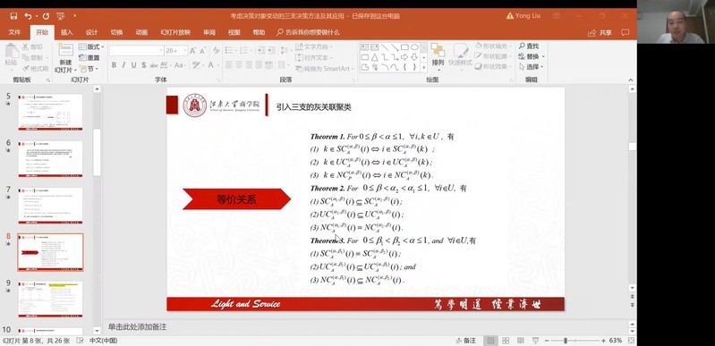 在本次学术讲座中,刘勇首先介绍了决策中的聚类分析等相关背景,然后介绍了传统灰关联聚类方法和传统灰关联聚类决策信息系统。接下来,介绍了基于三支决策的灰关联聚类方法、聚类阈值确定机制以及考虑决策对象变动的灰关联聚类方法。最后基于所提出的聚类方法,探讨了动态聚类模型在电影推荐系统案例中的有效性与合理性。
