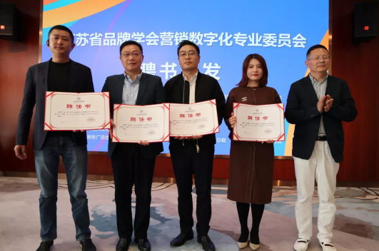 江苏省品牌学会副会长卜安洵为中国商务广告协会副秘书长、虎啸奖创始人、国际品牌观察杂志社总编辑陈徐彬颁发江苏省品牌学会营销数字化专业委员会会长聘书,陈徐彬为智子云CEO朱建秋、中国商务广告协会数字营销专业委员会常务副秘书长袁俊、兆腾科技创始人詹东宝颁发营销专委会副会长聘书,为中国商务广告协会数字营销专业委员会副秘书长、虎啸传媒战略运营副总裁姜微微颁营销专委会秘书长证书。
