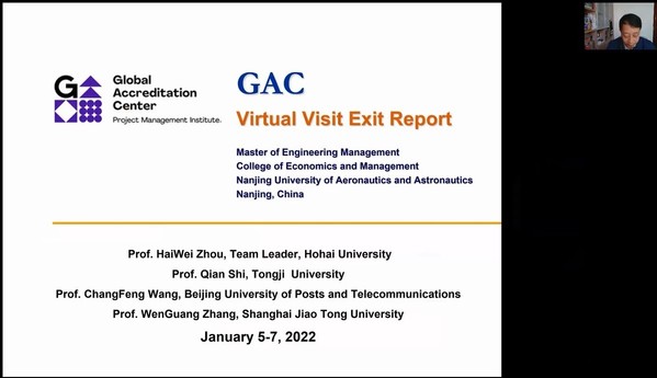 2022年1月5日-7日在经管学院举行了为期三天的现场考察评估(云端会议),现场考察评估组由河海大学周海炜教授担任组长,组员包括同济大学施骞教授、北京邮电大学王长峰教授以及上海交通大学张文光副教授。我校研究生院、经管学院的相关领导、教师及教学管理人员参加了现场考察与评估活动,党委书记苏州研究员主持仪式,研究生院副院长王英教授代表学校致欢迎辞,周德群院长介绍了学校和学院的总体情况,王子龙副院长对MEM专业硕士学位项目培养体系作了总体陈述,院长助理周志鹏就认证的具体问题向专家进行了详细汇报,相关领导与教师针对专家关心的问题一一作了回答。在为期三天的考察评估中,专家组通过云端会议翻阅查看了课程教学大纲、毕业论文、试卷及学生作业等项目资料,从多维度考察MEM专业硕士学位项目的核心教学内容与教学效果,通过在线方式与教师代表、学生代表、校友代表、教学管理人员代表以及用人单位代表分别进行了深入访谈,从多视角系统了解MEM专业硕士学位项目教育教学情况、办学特色和学员、雇主满意度。在现场考察评估意见反馈阶段,专家组对贝博官网MEM专业硕士学位项目的培养体系、教学管理模式和培养质量给予了高度评价,并一致推荐南航MEM专业硕士学位项目通过PMI-GAC认证。针对反馈意见,周德群院长、苏州书记分别做了表态发言,对考察评估专家组严谨细致的工作和提出的中肯意见表示衷心感谢,并表示将以此次认证为契机,进一步提升MEM专业硕士学位项目办学质量,为我国工程管理实践和航空航天领域的高端技术管理人才培养做出更大贡献。