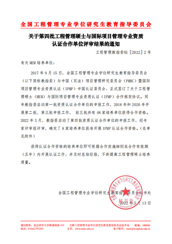 2017年9月15日,全国工程管理专业学位研究生教育指导委员会(以下简称教指委)与中国(双法)项目管理研究委员会(PMRC)暨国际项目管理专业资质认证(IPMP)中国认证委员会,正式签订了关于工程管理硕士(MEM)与国际项目管理专业资质认证(IPMP)合作框架协议。同年教指委启动第一批资质认证合作单位的申报工作,2018年和2020年开展第二批、第三批申报工作,前三批共有48家培养单位获得合作资格。2022年3月,教指委启动了第四批资质认证合作单位的申报工作,经专家评审组评审,确定了BB贝博艾弗森官方网站成为第四批工程管理硕士与国际项目经理资质认证(IPMP)培养合作单位。