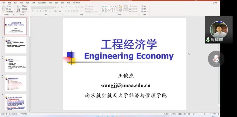 在王俊杰老师《工程经济学》的线上教学正式开始前,院长周德群对师生表示了慰问和关心,在线上教学成为新常态的情况下,希望同学们珍惜时光,依托线上教学带来的丰富资源充分打牢专业基础,积极拓宽学识视野,以饱满的姿态迎接新学期。