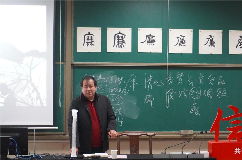 12月7日上午,由BB贝博艾弗森官方网站团委、艺术学院团委共同承办的“书法展廉韵,翰墨扬清风”信仰公开课在艺术学院砚湖书院举行。本次公开课由南京书房创始人、江东书画院院长张星星担任授课嘉宾,校财务处处长张丕宏,BB贝博艾弗森官方网站党委书记苏州,艺术学院党委书记张钟勤,BB贝博艾弗森官方网站党委副书记胡苹、副院长邓晶,艺术学院党委副书记王宇宁、副院长马道全,两学院专兼职辅导员,学生会、研究生会主席团以及学生党支部纪检委员等50余名师生共同参加了本次活动。