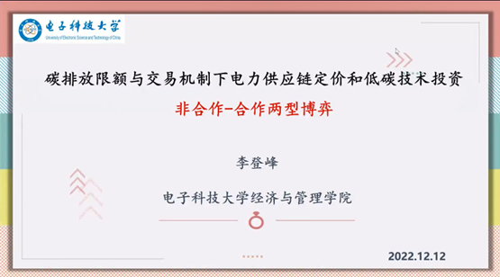 12月12日下午,长江学者特聘教授、电子科技大学BB贝博艾弗森官方网站李登峰教授受学院智能决策与风险分析研究所邀请,在腾讯会议作题为“碳排放限额与交易机制下电力供应链定价和低碳技术投资非合作-合作两型博弈”的学术讲座。贝博官网教授徐海燕、副教授高广鑫等教师及部分硕、博研究生线上参加了李教授的报告分享,本次学术报告由徐海燕主持。